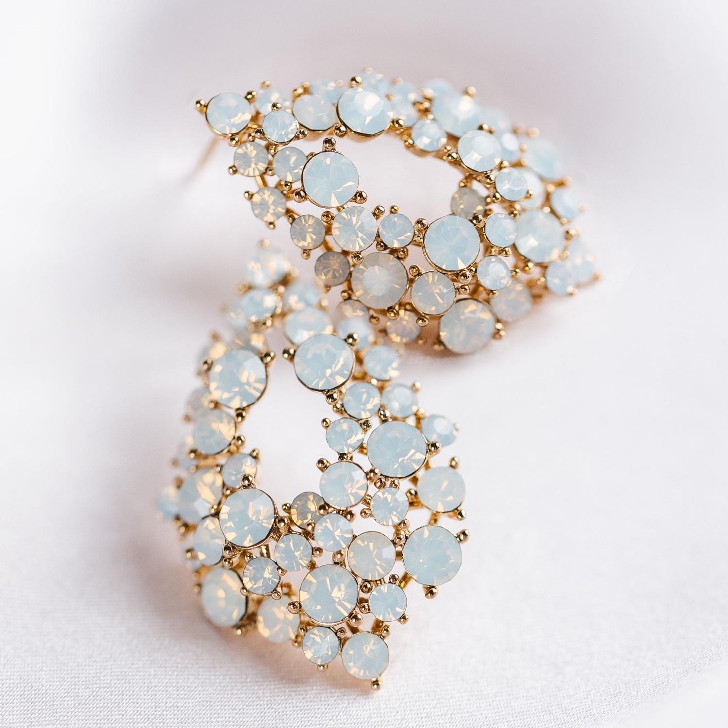 Alice örhängen, vita opal flerfacetterade Swarovski-kristaller som reflekterar ljuset på ett vackert sätt. Bär dem för att tillföra en subtil elegans till vardagslooks. Matcha med Miranda armbandet och ringen.