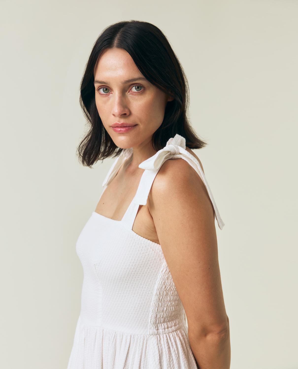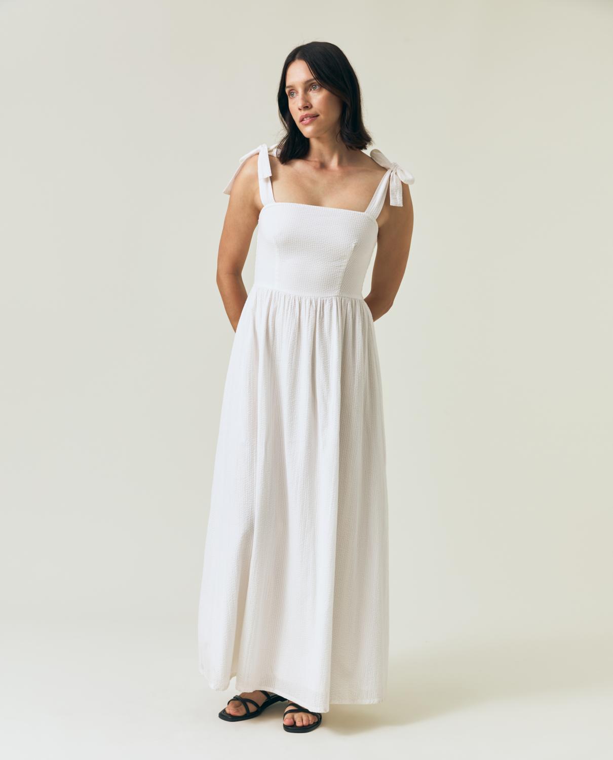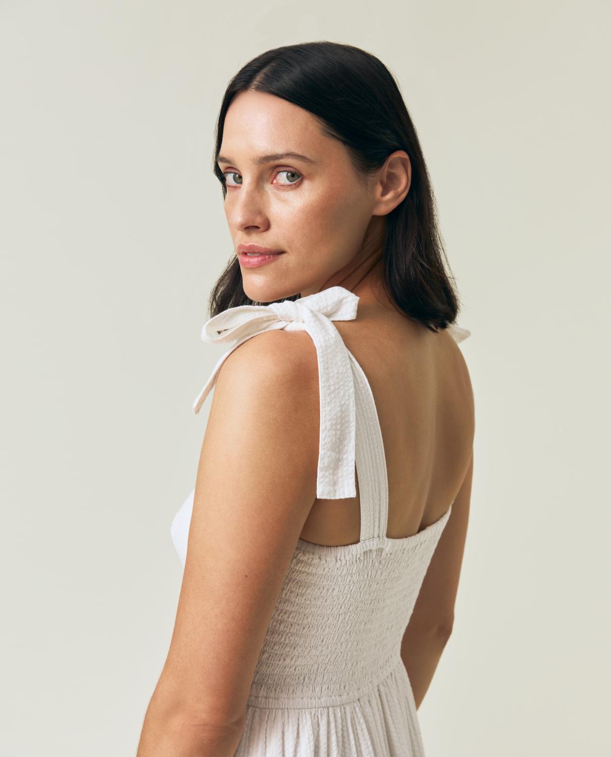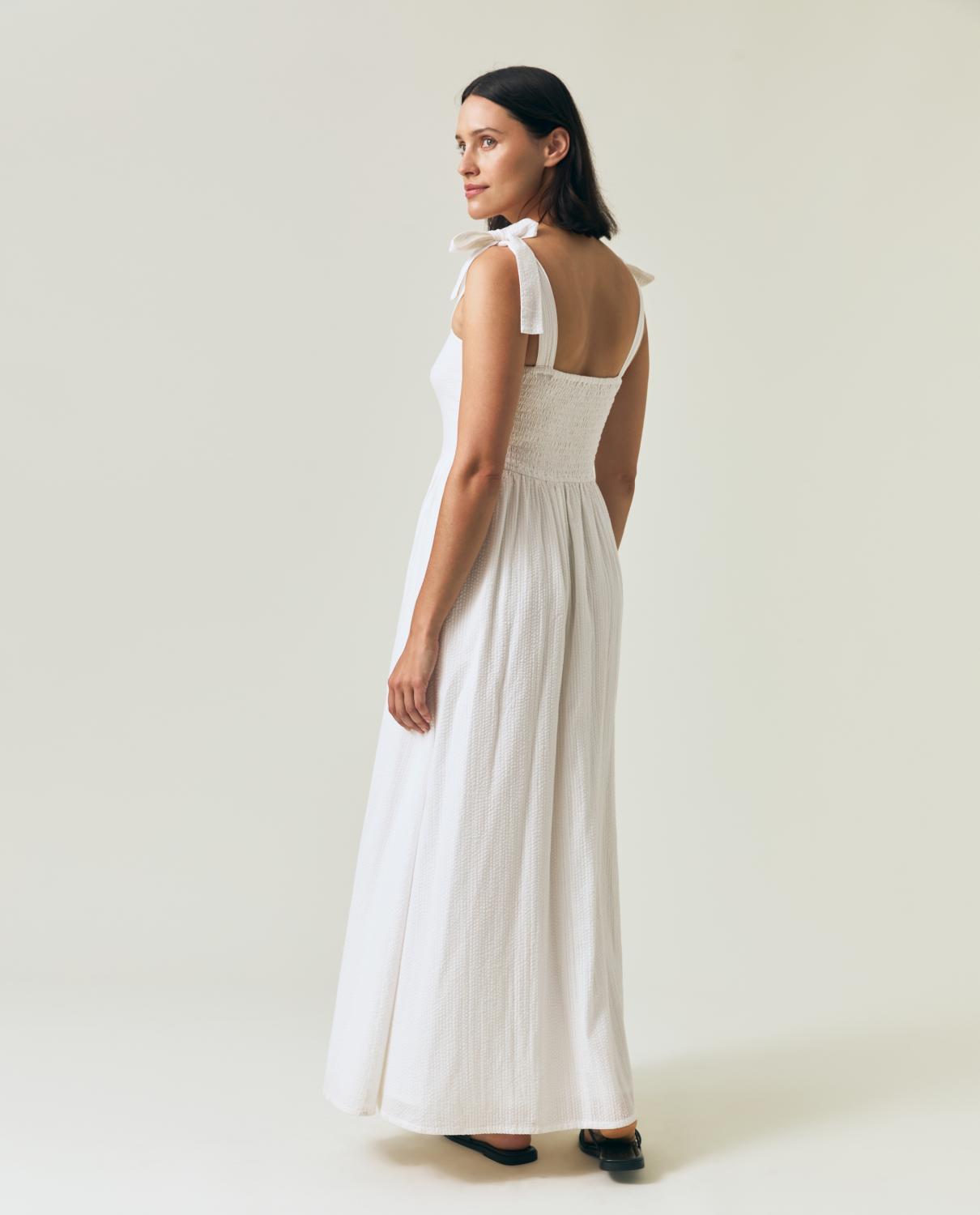 Denna seersucker-klänning med rosett är en perfekt blandning av charm och komfort. Med knytbara axelband ger den en avslappnad passform och en figurnära, utsvängd siluett. Vecken vid bysten och smocken på ryggen tillför en feminin touch, medan den hellånga kjolen ger ett elegant fall. Den här klänningen i seersuckertyg är idealisk för varma dagar och kombinerar luftig komfort med en avslappnad elegans.