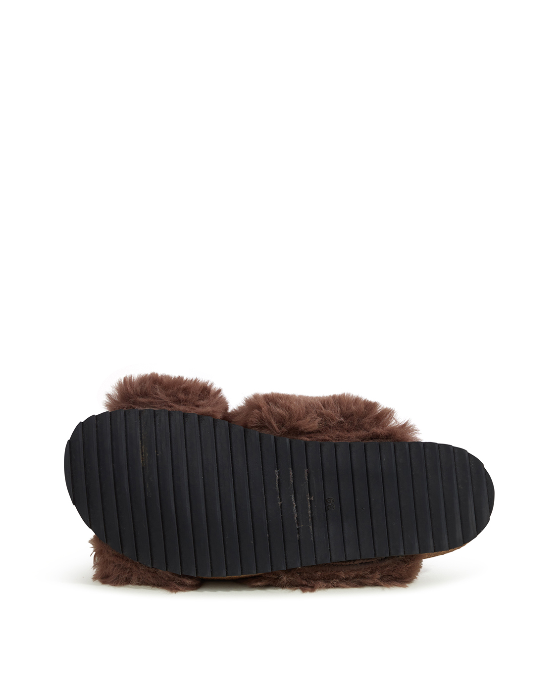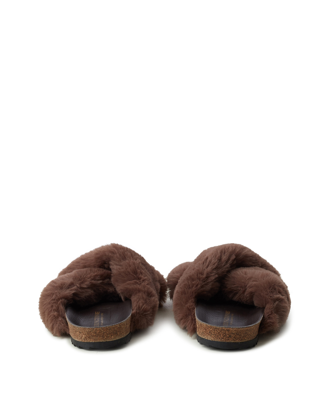 Härligt fluffiga tofflor i polyester som liknar fuskpäls, med innersula av rent läder och yttersula av kork och latex. Den dämpande, termoplastiska gummisulan och den mjuka fuskpälsen gör dessa tofflor både sköna och söta. Märkeslogotypen är tryckt på innersulan.