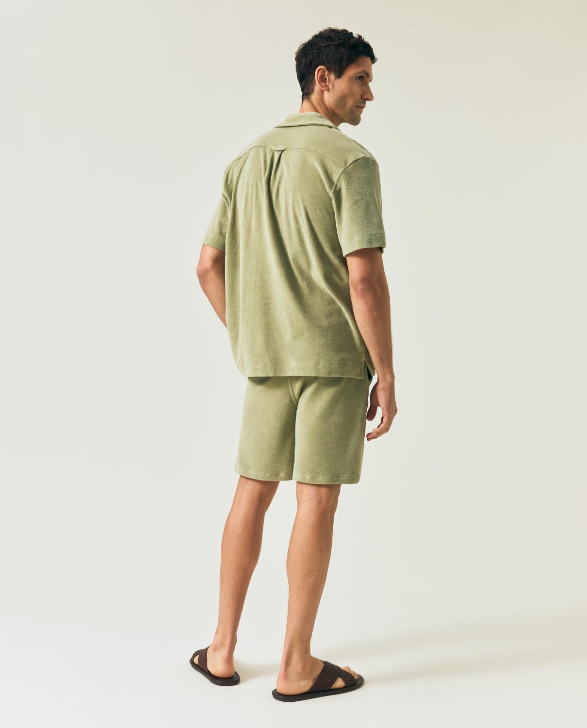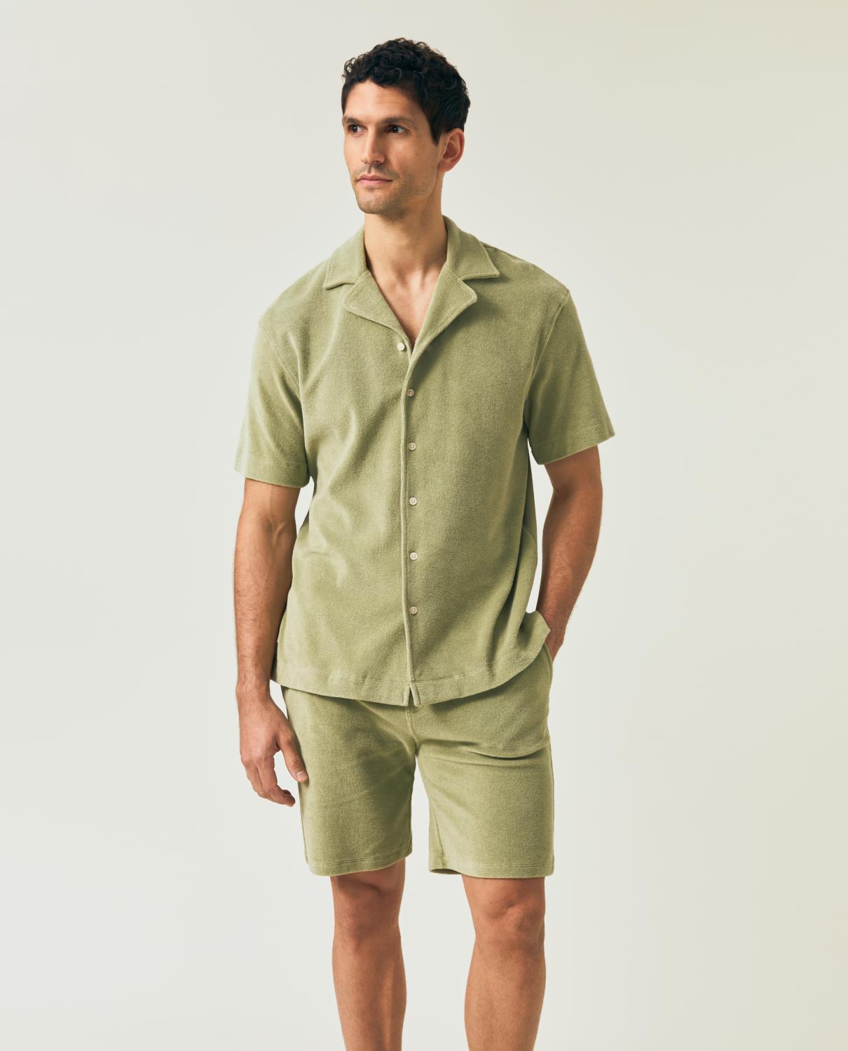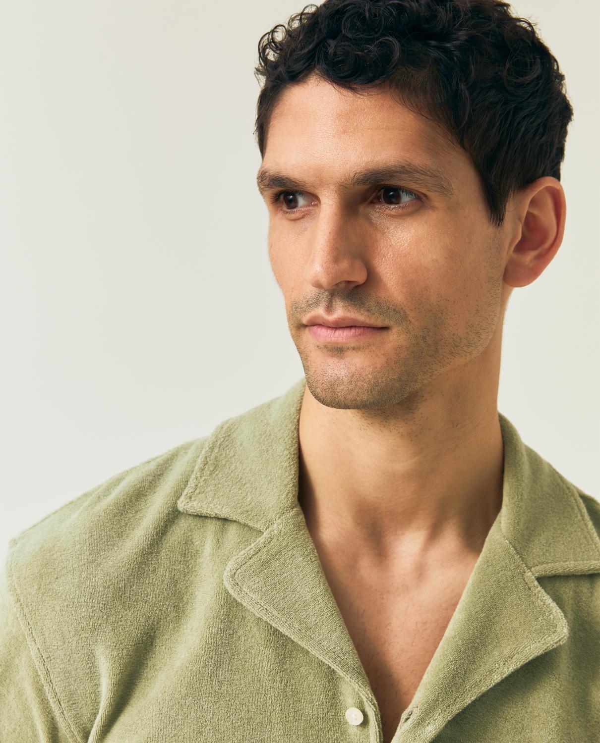 Skjorta med helskuren krage i ekologisk bomullsfrotté blandar enkelt avslappnad sofistikering med komfort. Den här skjortan med en helskuren krage och benvita knappar i återvunnen polyester är både stilfull och miljövänlig. Sidoslitsar nedtill och en Lexington flaggetikett i sidsömmen ger genomtänkta detaljer. Den är tillverkad av mörkblå eller grön ekologisk bomullsfrotté och ger en avslappnad men ändå raffinerad look som passar perfekt för vardagen.