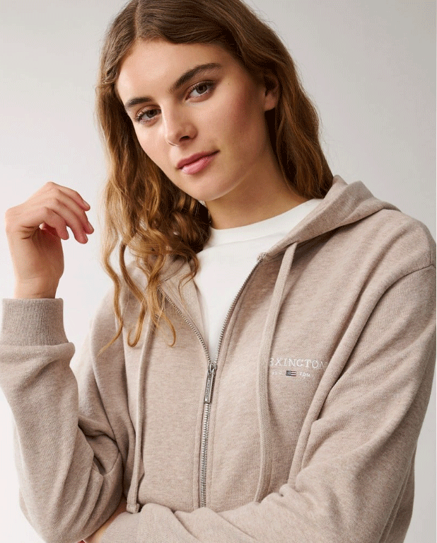 Vår luvtröja med blixtlås är perfekt för en ledig och avslappnad stil. Håll den till hands för svalare kvällar eller avkopplande helger. Den är tillverkad av 100 % collegetyg och har alla klassiska stildetaljer inklusive långa ärmar, tvåvägsblixtlås, passpoalfickor, ribbade muddar och midjeband samt en broderad Lexingtonlogga på bröstet. Kombinera med Jenna-tröjan för den perfekta "sweatsuit" -looken.