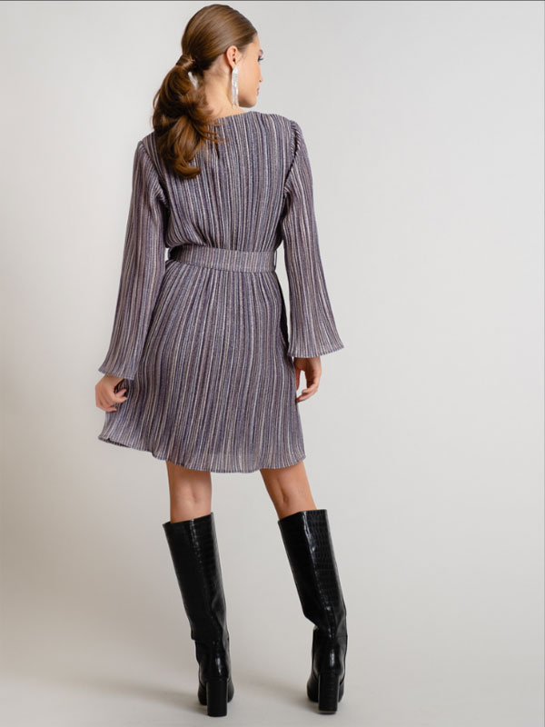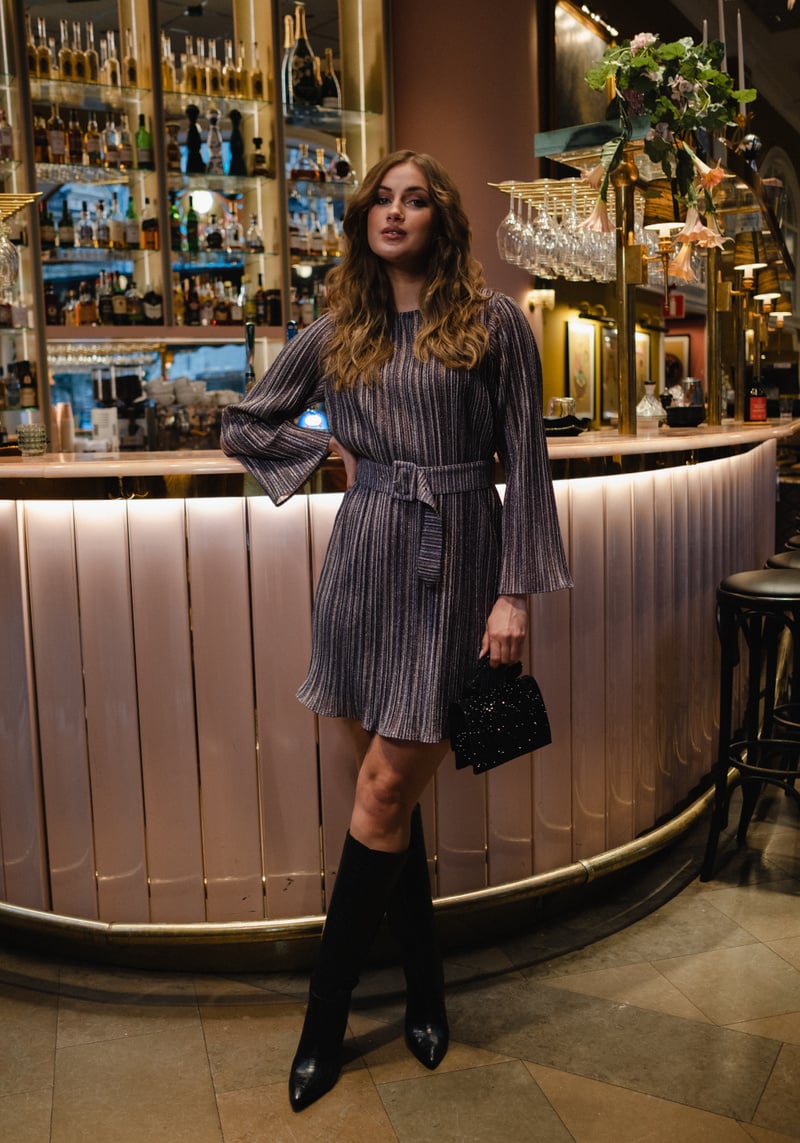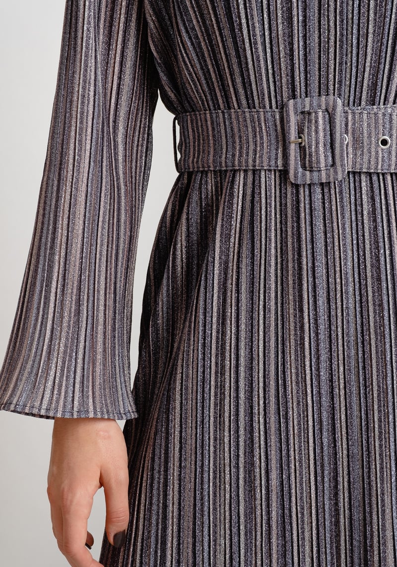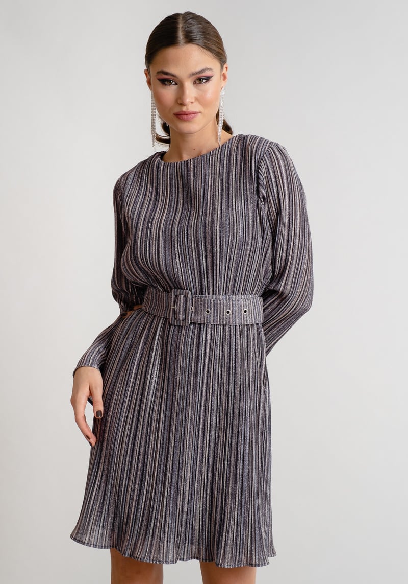Euphoria klänning är en mångfärgad skönhet! Den kommer i ett plisserat gnistrande tyg, med lätt klockformade, långa ärmar. Har även ett valfritt matchande bälte i midjan och en dold knapp i urringningen bak, för en snygg stängning.