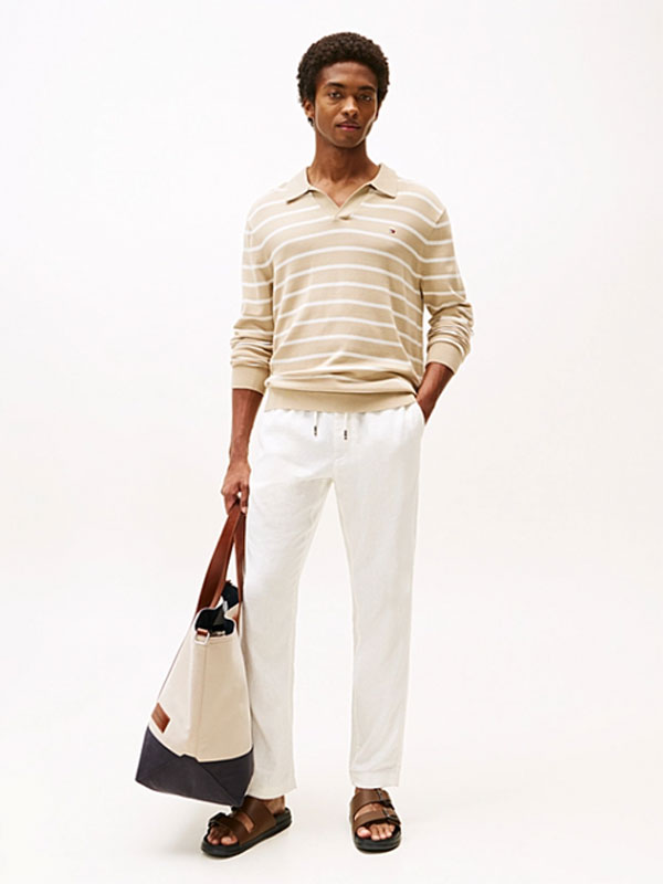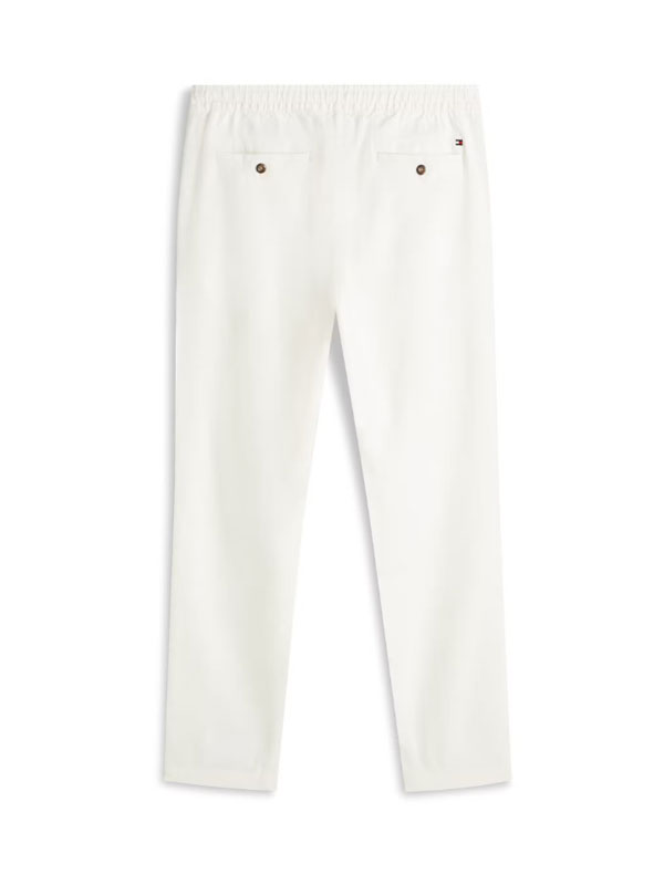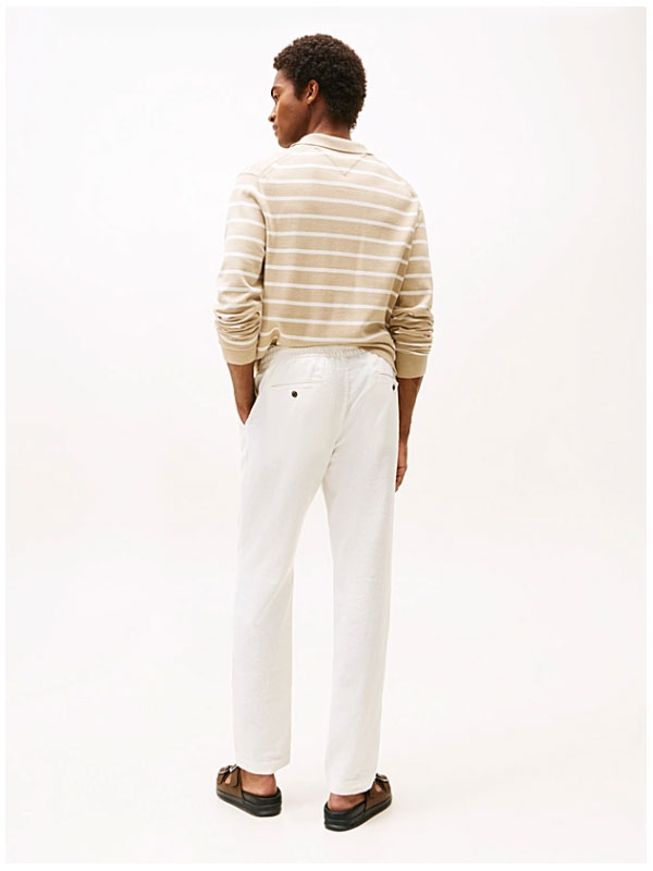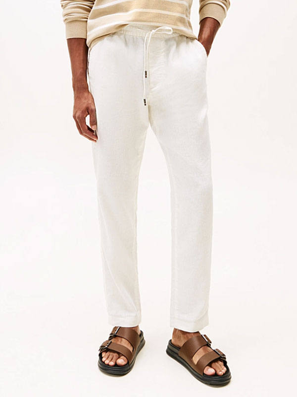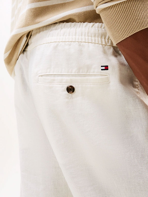 Dessa byxor är tillverkade av ett linneblandat tyg för en lätt känsla och har en dragsko i midjan för att förstärka den avslappnade stilen.