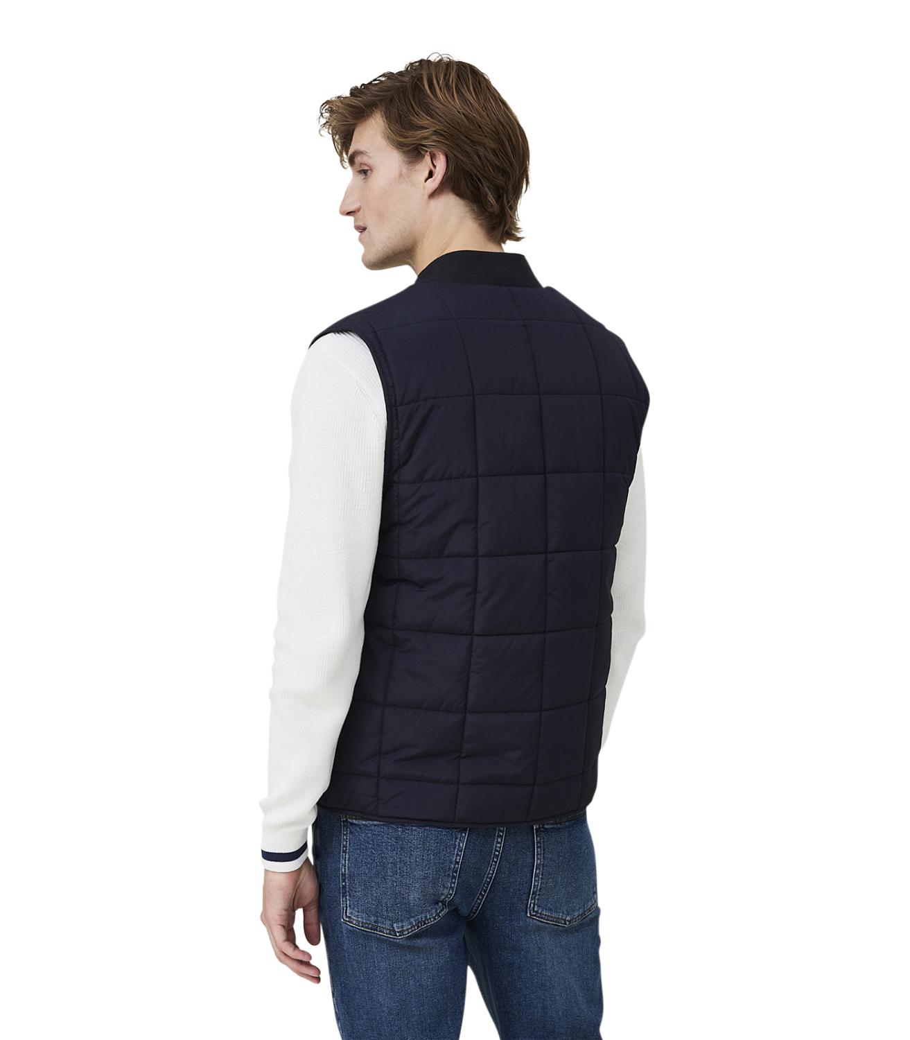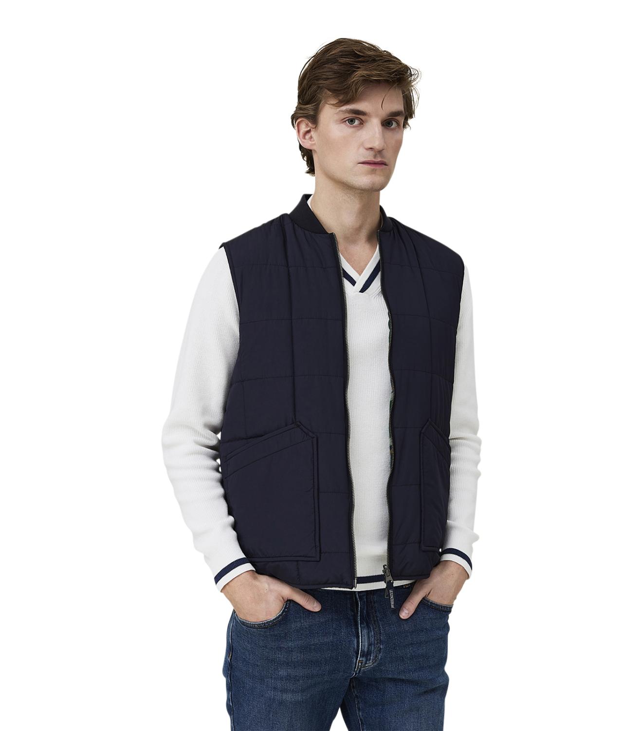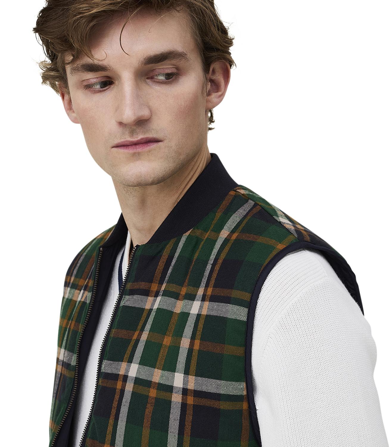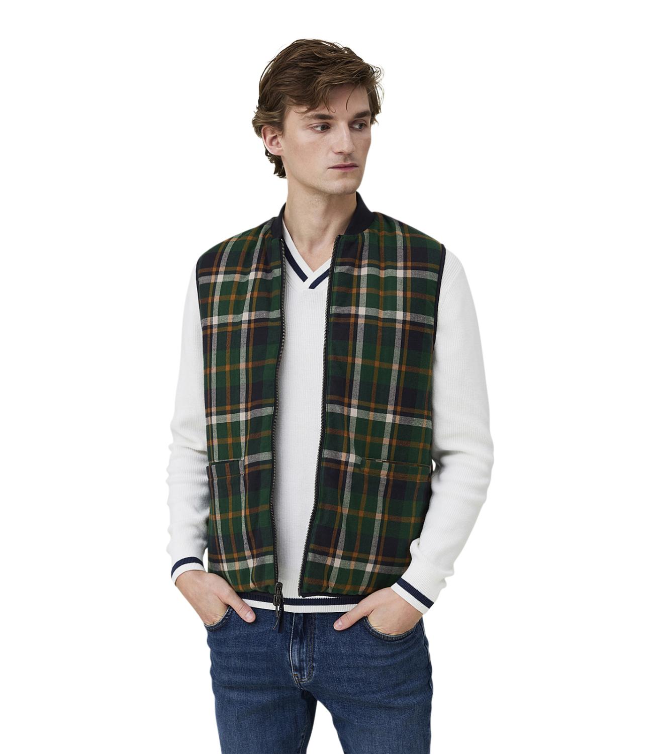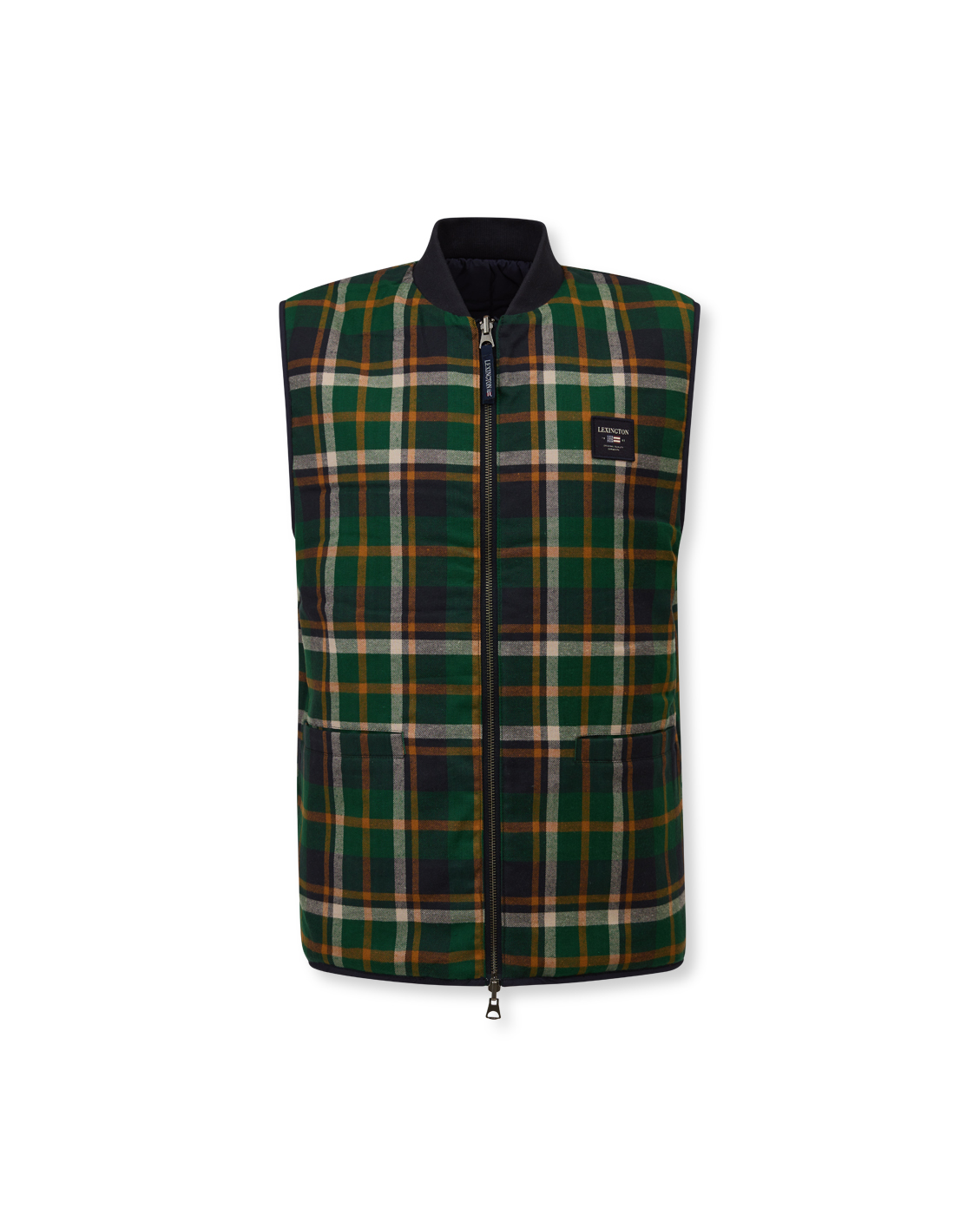 Denna vändbara väst har en fyrkantig quiltdesign, ena sidan gjord av återvunnen polyester, medan den andra sidan har en bomullsgarnfärgad rutig design.