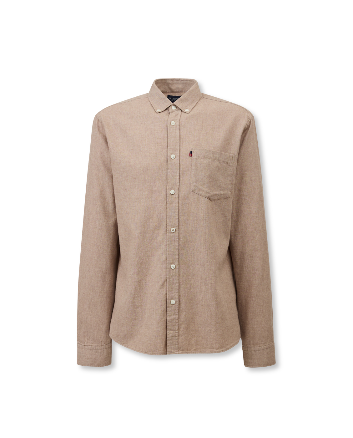 en classic fit av borstad bomullsflanell blandat med melerat garn har buttondownkrage och knäppning framtill med logotyppräglade knappar i hornimitation och en bröstficka med Lexingtonflaggan. Ytterligare detaljer för denna bomullsskjorta är rundad nederkant och manschett, boxplissering i ryggen och mjukt mellanlägg i krage, manschett och knappslå.
