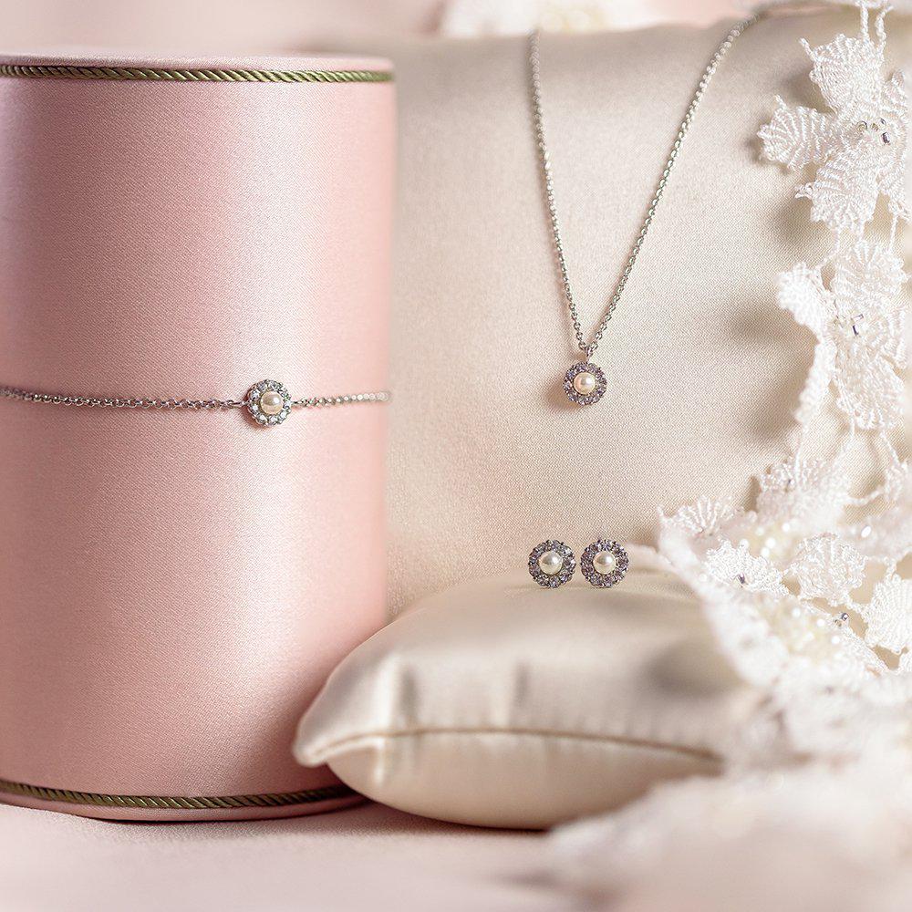 En annan klassiker från vår kollektion, denna tre-delars set inkluderar våra Petite Miss Sofia örhängen, armband och halsband. En rund ram av klara Swarovski-kristaller omger ömt en dyrbar vit pärla. Dessa delar är alla i silver. Gör den perfekta presenten för varje tillfälle. Gå vidare och ge dig själv en p
