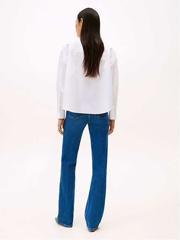 En fräsch och feminin tolkning av en klassisk stil. Denna skjorta i ren bomullspoplin har en överdimensionerad passform och en lekfull flugakrage.