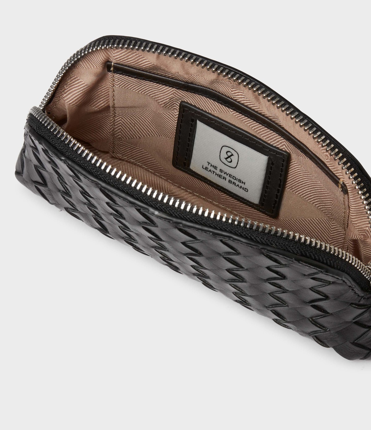 Sminkväska Rosa från Saddler. Komplettera din väska med den här eleganta sminkväskan i ett mjukt flätat full grain-läder. Insidan har ett vackert ljust foder i polyester med två öppna fack. Försluts med dragkedja i blank silverfärgad metall. En perfekt liten sminkväska som rymmer det viktigaste. Kan även användas som plånbok.