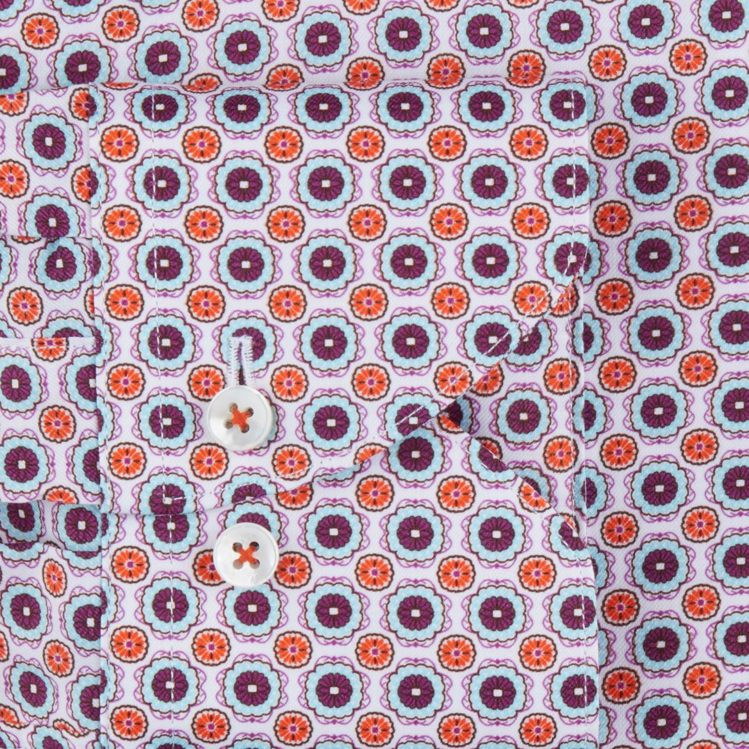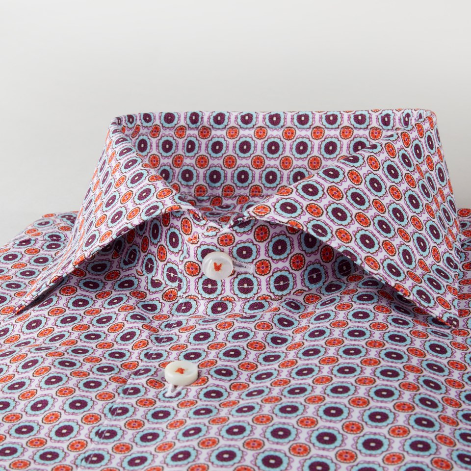 Tegelfärgad, mönstrad Slimline-skjorta skuren från Superior twill för en smal passform. Detaljerad med ett prickigt mönster i vinrött och orange. Ytterligare detaljerad med vita Pärlemorknappar med orange knapptråd, enkla manschetter och cut away-krage. Bär den under en kabelstickad tröja för en avslappnad och stilren look. Semi cut away, krage 90.