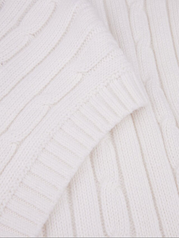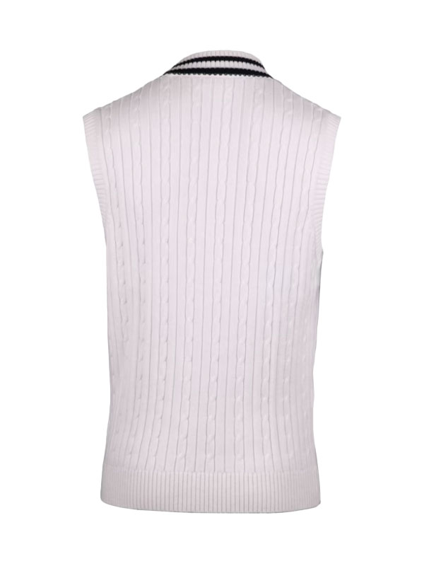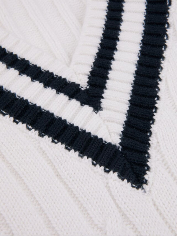 Denna kabelstickade v-ringade slipover är tillverkad av bomull och kashmir. Tröjan har ränder i kontrastfärg och ribbstickade detaljer vid krage, ärm- och plaggslut.